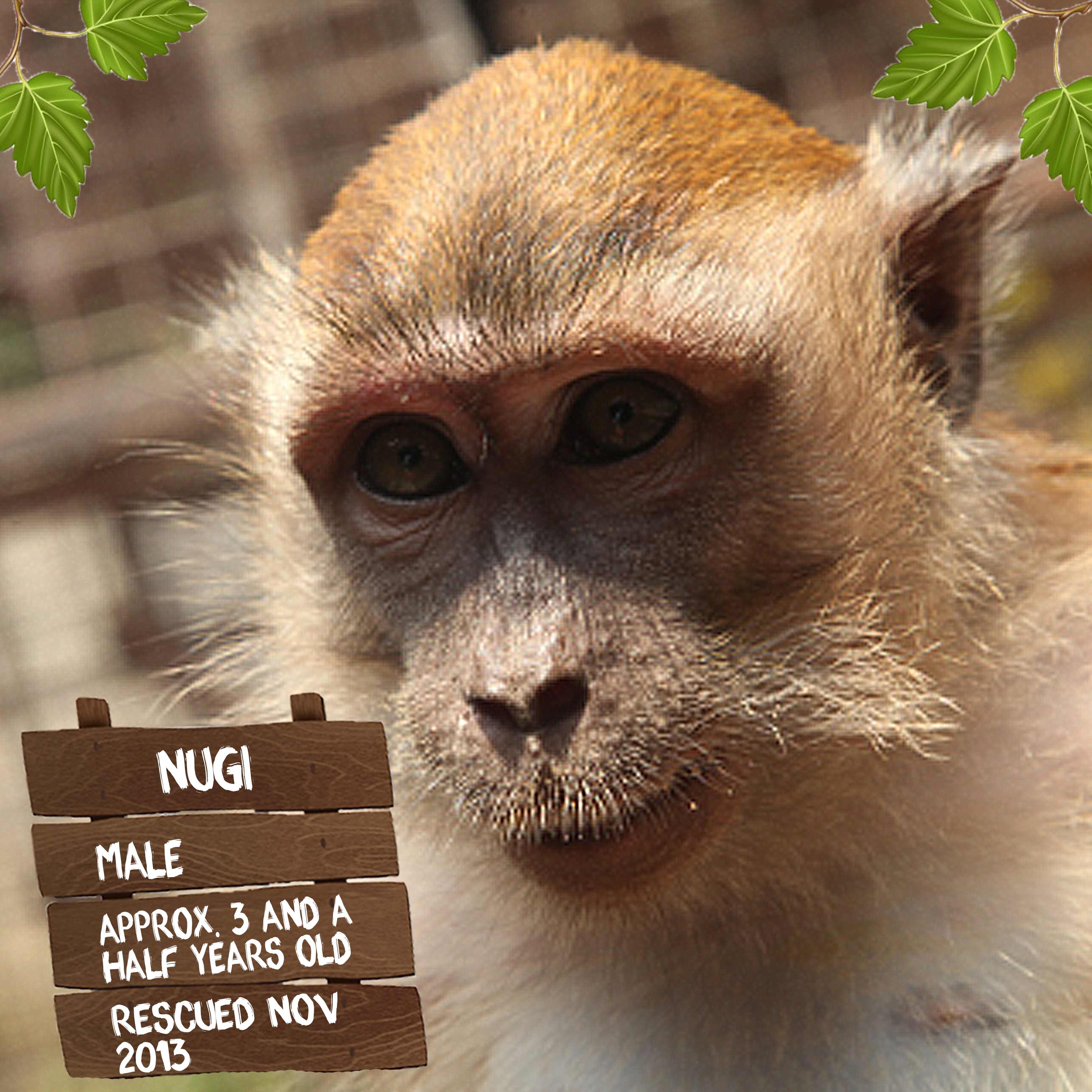 This is Nugi. He was terrified of people when first arriving at our facility. After many socializing sessions he has become more comfortable but still isn’t happy in general, when people are around. He is always in defense the moment care takers approach the enclosure which is a good trait for when when we return him back to the forest. He is part of our larger group, leaded by Coki and he is a cheeky little monkey. He loves to challenge all other group members. He is the funniest of his little ‘gang’ consisting of the other young ones. He is always doing funny tricks to entertain the others.