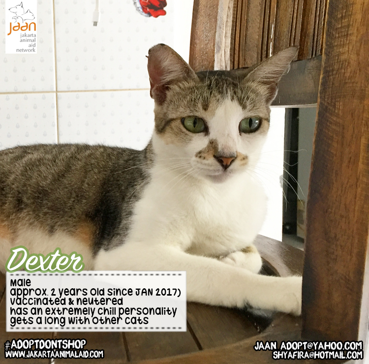 Rescued a little over a year ago. Dexter has an extremely ‘chill’ personality. He is completely content to just sit on a comfortable chair & watch. He gets a long with other cats & will ‘tolerate’ dogs. He will show them who is boss if they come to close. Will his chill personality he would be suitable for many house holds!