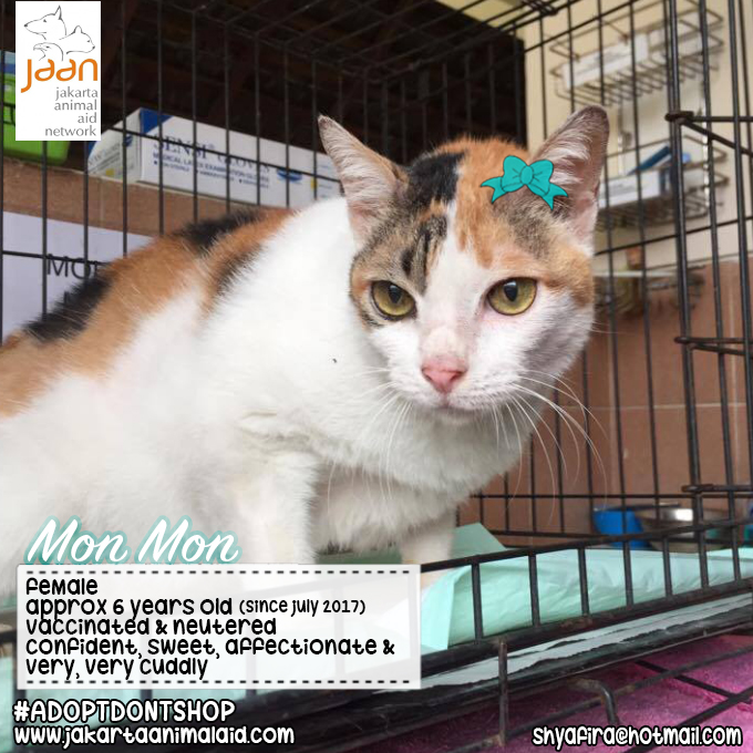 This is Mon Mon. She was rescued from her previous owner who was an elderly & sadly suffered from dementia. Mon Mon is very sweet, curious, confident & loves affection. A purrfect easy going kitty, great addition to any family! Please contact us if you would like to give Mon Mon her forever home.