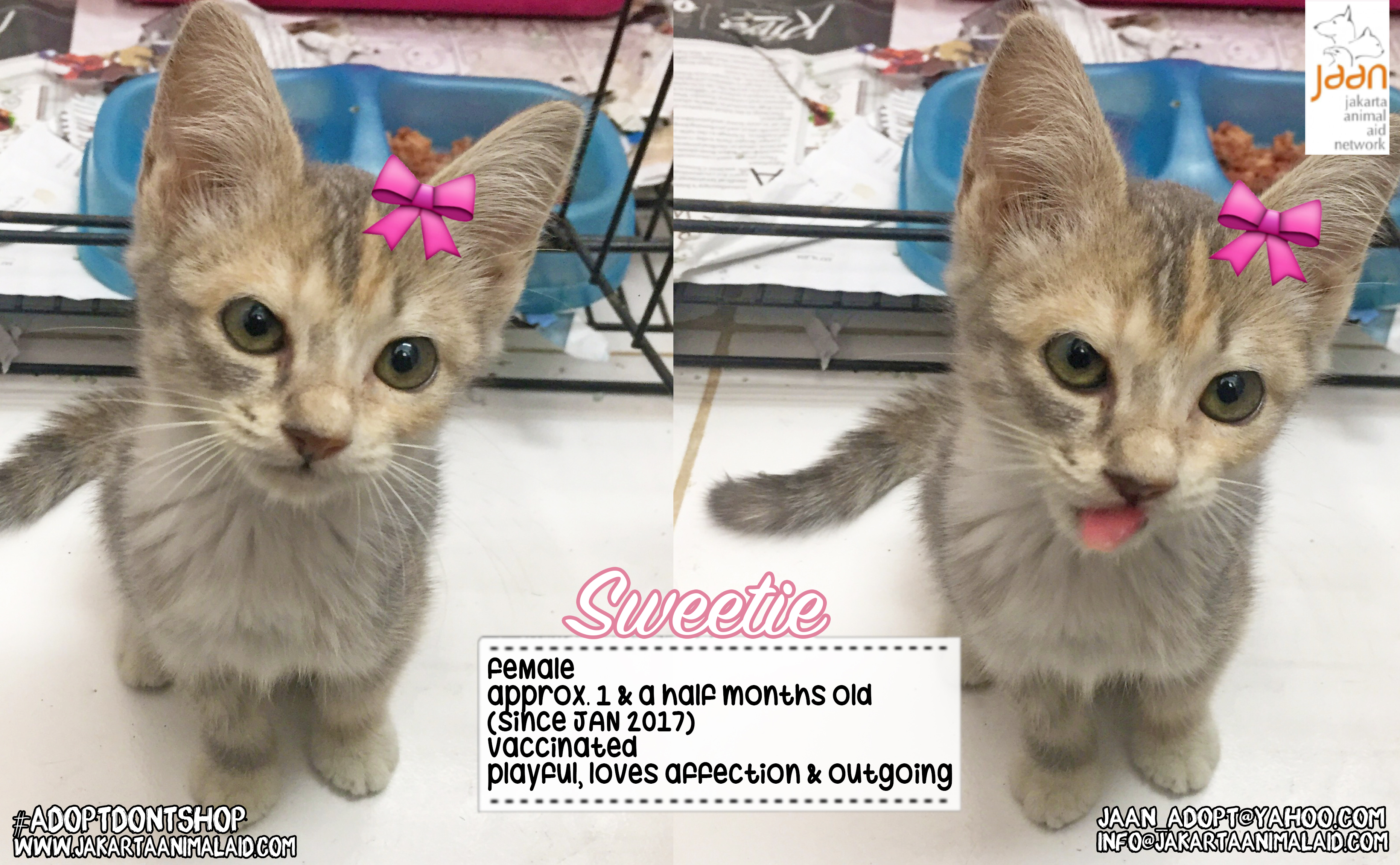 Little Sweetie was rescued just outside of Animal Clinic Jakarta. She was so tiny & malnourished. She is very clean even though she still needs her vaccinations. She is well definitely on the way to a full recovery. Sweetie is not shy at all. She loves affection & to play with anything. She enjoys suckling on your hands & loves cuddles. She has as a beautiful pale tortoise shell coat & with her outgoing personality, she will make a great family cat!